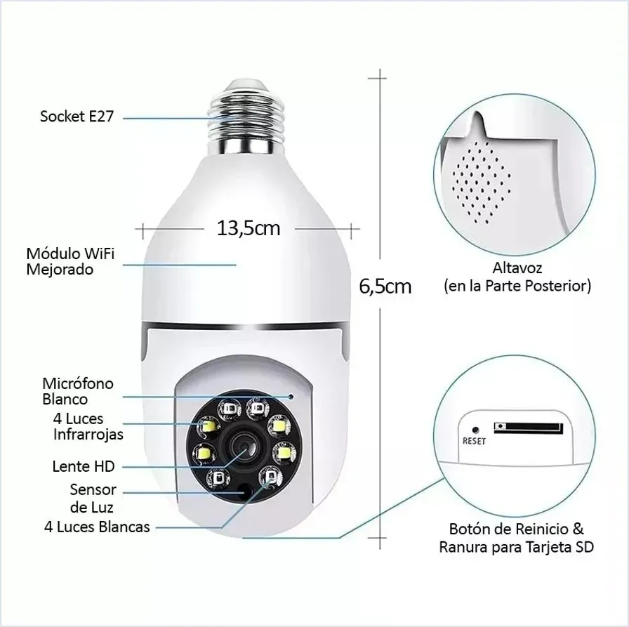 Cámara Tipo Bombillo Base E27 Ip Wifi Ptz 2mp Hd App V380